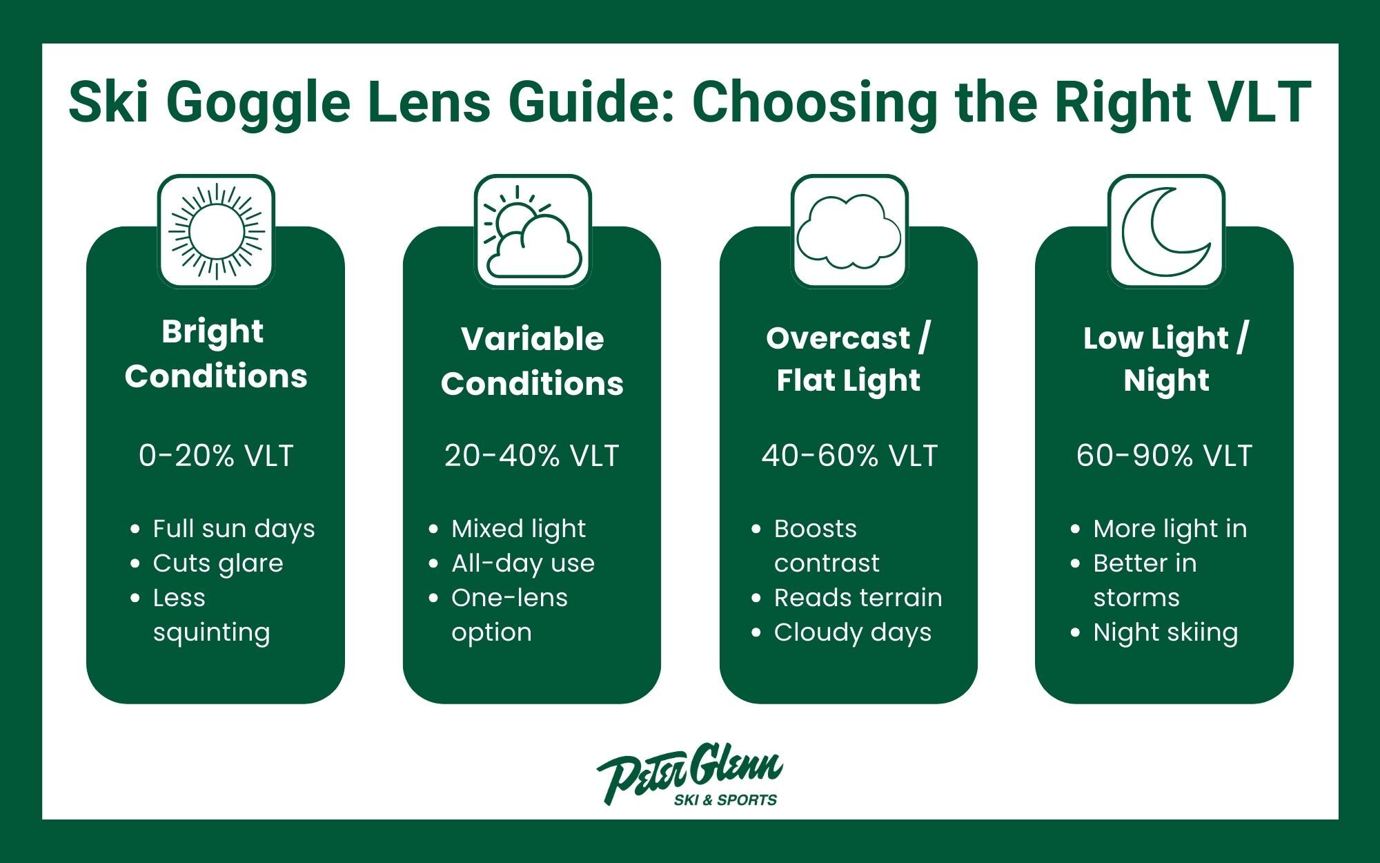 - Low light/night (60-90% VLT): A low-light lens or clear lens for night skiing and heavy overcast conditions