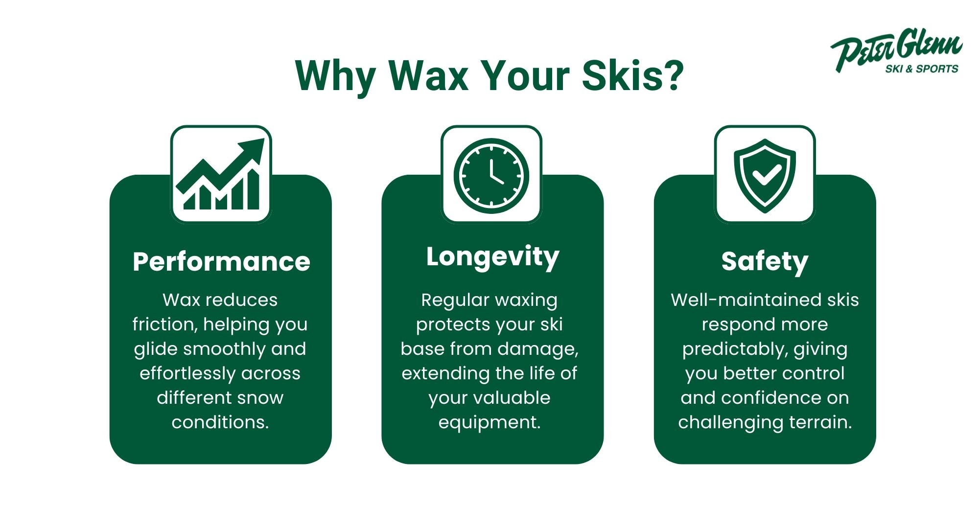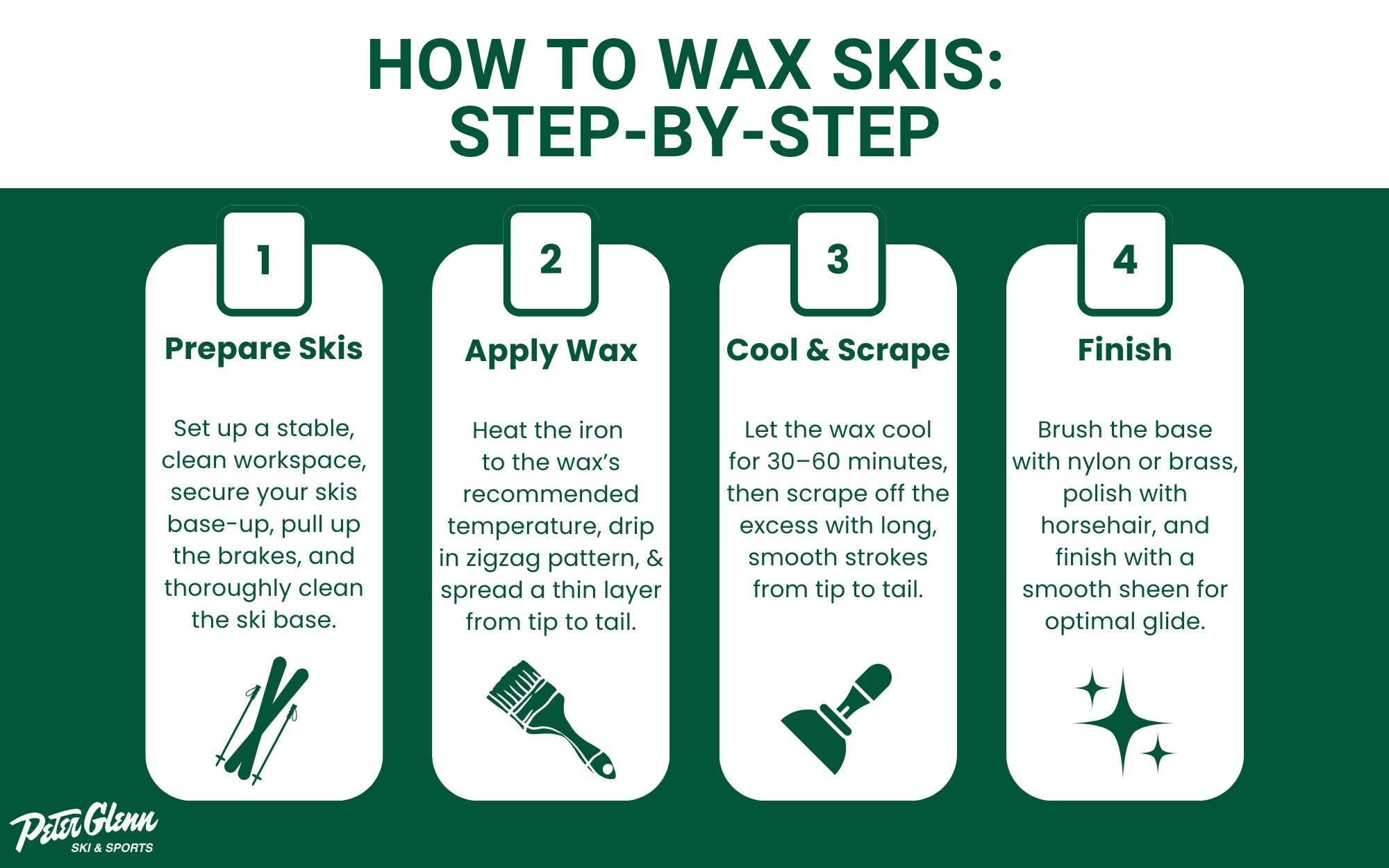 Disclaimer: For the most consistent results, professional waxing is always recommended. Expert technicians have the tools, training, and knowledge to apply the right wax for your skis and the snow conditions. This helps you avoid mistakes, extend ski life, and maximize performance. If you would rather leave it to the pros, Peter Glenn offers in-store ski waxing services to keep your gear slope-ready.